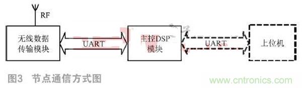 在傳感器網(wǎng)絡(luò)中,采用ZigBee通信協(xié)議時,節(jié)點(diǎn)被分為Coordinator、Router以及End Device三種。Coordinator負(fù)責(zé)系統(tǒng)的初始化工作,選擇網(wǎng)絡(luò)的信道等參數(shù)建立網(wǎng)絡(luò),供其他節(jié)點(diǎn)加入;Router負(fù)責(zé)節(jié)點(diǎn)之間命令消息的路由轉(zhuǎn)發(fā)實(shí)現(xiàn);End Device負(fù)責(zé)任務(wù)是消息的發(fā)送和接收,只能和父節(jié)點(diǎn)進(jìn)行數(shù)據(jù)通信,不具有路由轉(zhuǎn)發(fā)的功能。在本系統(tǒng)中,Sink節(jié)點(diǎn)主要負(fù)責(zé)監(jiān)控網(wǎng)絡(luò)的建立、上位機(jī)命令的分析處理和操作、數(shù)據(jù)的收集等任務(wù),是整個網(wǎng)絡(luò)的數(shù)據(jù)存儲和處理中心,在上位機(jī)和監(jiān)控網(wǎng)絡(luò)之間起到橋梁的作用,是系統(tǒng)應(yīng)用中的Coordinator。監(jiān)控網(wǎng)絡(luò)區(qū)域內(nèi)的待定位節(jié)點(diǎn)要具備消息轉(zhuǎn)發(fā)與路由其他節(jié)點(diǎn)的能力,需要可以給所有節(jié)點(diǎn)發(fā)送消息,也可以接收到所有節(jié)點(diǎn)的消息,是系統(tǒng)應(yīng)用中的Router。每個節(jié)點(diǎn)由無線數(shù)據(jù)傳輸模塊和主控DSP模塊組成,同一節(jié)點(diǎn)的兩個模塊之間通過UART總線進(jìn)行通信。節(jié)點(diǎn)之間通過無線RF射頻方式進(jìn)行通信。Sink節(jié)點(diǎn)與上位機(jī)使用UART總線進(jìn)行通信,未知節(jié)點(diǎn)的通信方式中并不包含該通信方式。節(jié)點(diǎn)的通信方式如圖3所示。