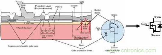 至于為什么不使用耗盡型的MOS管,不建議刨根問底。對于這兩種增強(qiáng)型MOS管,比較常用的是NMOS。原因是導(dǎo)通電阻小且容易制造。所以開關(guān)電源和馬達(dá)驅(qū)動的應(yīng)用中,一般都用NMOS。下面的介紹中,也多以NMOS為主。在MOS管原理圖上可以看到,漏極和源極之間有一個寄生二極管。這個叫體二極管,在驅(qū)動感性負(fù)載(如馬達(dá)),這個二極管很重要。順便說一句,體二極 管只在單個的MOS管中存在,在集成電路芯片內(nèi)部通常是沒有的。下圖是MOS管的構(gòu)造圖,通常的原理圖中都畫成右圖所示的樣子。 (柵極保護(hù)用二極管有時不畫)