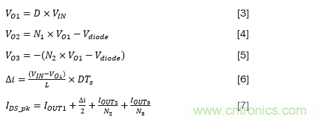 其中VO1是主輸出,VO2和VO3分別是正和負(fù)次級輸出,D是占空比,N1和N2分別是與VO2和VO3對應(yīng)的變壓器的匝數(shù)比。Vdiode是二極管的正向壓降,IOUT1、IOUT2和IOUT3分別是由VO1、VO2和VO3生成的輸出電流,Ids_pk是通過頂部開關(guān)的峰值電流,△i是主電感器紋波電流的三角部分。