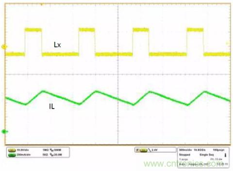 在高壓側(cè)開關(guān)接通的周期中(圖5中綠色箭頭指示電流),電感器電流斜坡上升,將能量儲存在電感器中,輸出電容器向負(fù)載提供電流。在低壓側(cè)開關(guān)接通的周期中(圖5中紅色箭頭指示電流),電感器電流斜坡下降,向負(fù)載提供電流,并為輸出電容器充電。ISL85415EVAL2Z反相降壓-升壓電路板的工作波形如圖6所示。