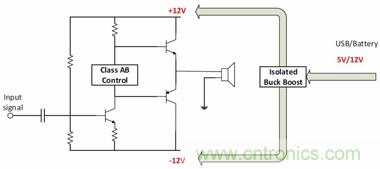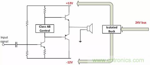 為這類應(yīng)用選擇合適的拓?fù)鋾r,需要考慮輸入電壓。例如,為以±12V軌運(yùn)行的音頻放大器供電,如果輸入電源軌是24V,就選擇隔離式降壓拓?fù)?。如果使?2V電池,就可以用反相降壓-升壓拓?fù)?,以生成?fù)壓軌。如果使用5V USB、12V電池或綠色能源供電的系統(tǒng),就應(yīng)該采用隔離式降壓-升壓拓?fù)?。圖12說明了如何用各種拓?fù)浣o音頻放大器供電。