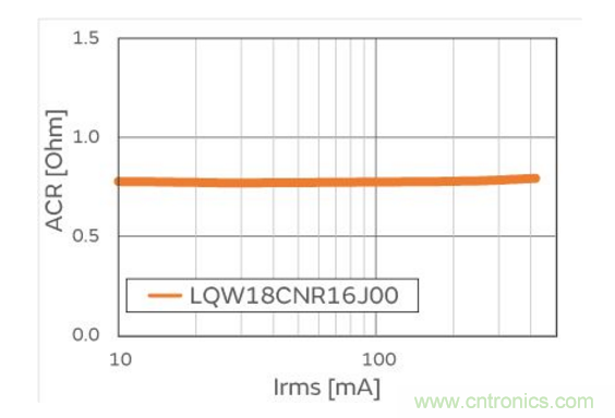 由于電感器的電流值發(fā)生變化,電感值也會(huì)發(fā)生變化。如圖2所示,LQW18CN系列對于AC電流的電感值依存性非常小。因此,即使NFC電路流通的AC電流變大,特性也不會(huì)發(fā)生很大變化。此外,如圖3 所示,即使是大電流也能保持低ACR。