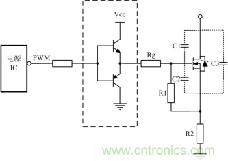 如果選擇MOS管寄生電容比較大,電源IC內(nèi)部的驅(qū)動(dòng)能力又不足時(shí),需要在驅(qū)動(dòng)電路上增強(qiáng)驅(qū)動(dòng)能力,常使用圖騰柱電路增加電源IC驅(qū)動(dòng)能力,其電路如圖 2虛線框所示。