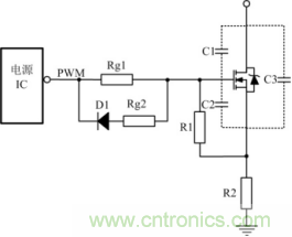 關(guān)斷瞬間驅(qū)動(dòng)電路能提供一個(gè)盡可能低阻抗的通路供MOSFET柵源極間電容電壓快速泄放,保證開關(guān)管能快速關(guān)斷。為使柵源極間電容電壓的快速泄放,常在驅(qū)動(dòng)電阻上并聯(lián)一個(gè)電阻和一個(gè)二極管,如圖3所示,其中D1常用的是快恢復(fù)二極管。這使關(guān)斷時(shí)間減小,同時(shí)減小關(guān)斷時(shí)的損耗。Rg2是防止關(guān)斷的時(shí)電流過大,把電源IC給燒掉。