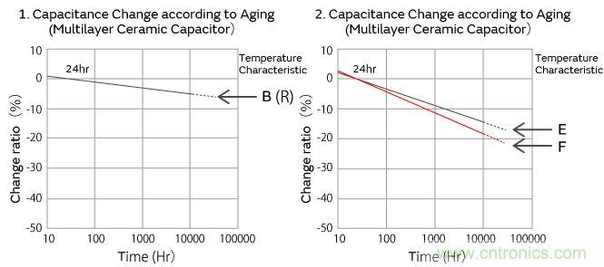 高誘電系的積層陶瓷電容器的靜電容量,以經(jīng)過125℃以上的熱處理24小時后的值作為基準,與時間成對數(shù)關系直線性下降。請參考如下村田制品靜電容量老化特性的代表例子。