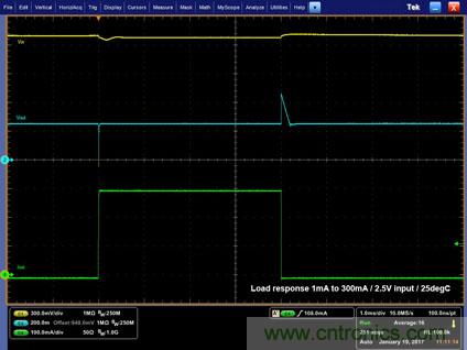 a) 由于有限的控制回路速度,負(fù)載電流的快速變化會(huì)導(dǎo)致輸出電壓的變化。有時(shí)內(nèi)部調(diào)節(jié)回路無(wú)法對(duì)電流的快速變化(由于時(shí)間延遲)作出反應(yīng),就會(huì)導(dǎo)致通常約為幾十毫伏(mV)的下沖/過沖。