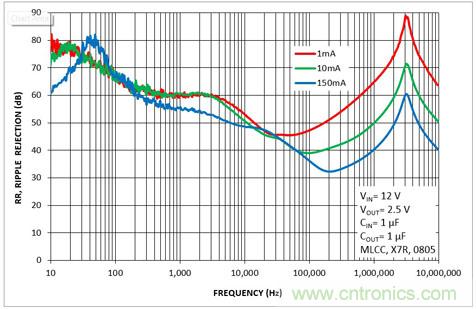 b)輸入電壓的快速變化(通常是由DC-DC轉(zhuǎn)換器的輸出電壓紋波引起的)無(wú)法通過控制回路完全過濾,于是輸入電壓的變化會(huì)一定程度地反映在輸出電壓中,該參數(shù)稱為電源抑制比(PSRR),且通常是頻變參數(shù)。一些制造商標(biāo)示的PSRR為負(fù)數(shù),有些則為正數(shù)。一般而言,PSRR絕對(duì)值越高,從輸入到輸出的傳輸干擾信號(hào)就越少。通常情況下,受到干擾的輸入電壓會(huì)以mV或更低的單位級(jí)別傳輸至輸出端。相似地,輸入電壓的快速變化(即“線路瞬態(tài)響應(yīng)”)可發(fā)生于LDO輸出端。