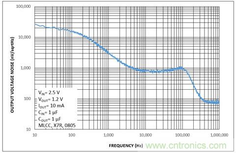 c)半導(dǎo)體結(jié)構(gòu)自身會(huì)產(chǎn)生固有的噪聲,主要是由自由原子與基礎(chǔ)材料晶體結(jié)構(gòu)碰撞而引起。由于固有噪聲是一種半導(dǎo)體中與電流傳導(dǎo)原理相關(guān)的物理現(xiàn)象,因此可以通過一些技術(shù)來(lái)抑制,但是不可能將其徹底去除。現(xiàn)代LDO的輸出噪聲可以達(dá)到數(shù)以百計(jì)的微伏(uV)甚至更小,但是頂級(jí)LDO產(chǎn)生的噪聲就會(huì)達(dá)到微伏(uV)單位。