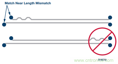 同一差分對(duì)內(nèi)的走線間距在全長(zhǎng)范圍內(nèi)須保持不變。如果差分走線彼此靠近布線,它們將影響總阻抗。如果此間距在驅(qū)動(dòng)器與接收器之間變化不定,則一路上會(huì)存在阻抗不匹配,導(dǎo)致反射。