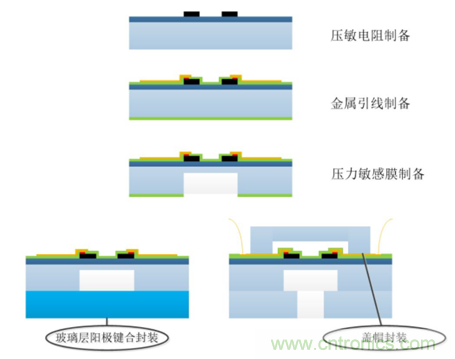 SOI高溫壓力傳感器的制備工藝涉及多道MEMS工藝,此處簡單介紹一些關(guān)鍵步驟以供了解傳感器的工藝過程,如圖3所示,主要包括壓敏電阻制備、金屬引線制備、壓力敏感膜制備以及壓力腔封裝等工藝。