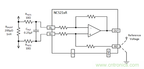 在瞬態(tài)共模電壓大于30伏特(V)的應(yīng)用中,需要瞬態(tài)抑制電路。有關(guān)如何設(shè)計瞬態(tài)抑制電路的詳細信息,請參閱NCS21xR數(shù)據(jù)表中的基本連接應(yīng)用注釋。
