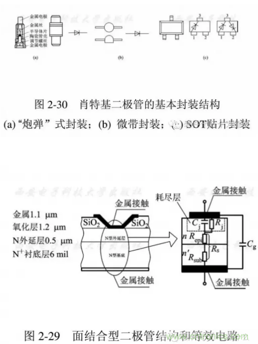 因此性能穩(wěn)定,一致性好,不易損壞。圖中給出一種面結(jié)合型二極管的結(jié)構(gòu)圖和等效電路。從中可以看出各部分的結(jié)構(gòu)尺寸量級(jí)。通常這種管芯要進(jìn)行封裝才能方便地使用。肖特基勢(shì)壘二極管的典型封裝結(jié)構(gòu)可采用“炮彈”式、微帶式、SOT貼片式等如圖2-30所示。