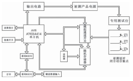 在測試過程中,被測產(chǎn)品的延時數(shù)據(jù)的檢測是通過對檢測信號(用被測產(chǎn)品的延時閉合的動合觸點)來進行監(jiān)測,而被檢測產(chǎn)品的工作電源又為工作變壓器初級線圈(一般都為批次檢測)屬電感性負載。由于對被檢測的產(chǎn)品的時間延時參數(shù)是與產(chǎn)品工作電源的加入同步進行,待被檢測的產(chǎn)品并對其延時參數(shù)數(shù)據(jù)進行存儲都完成后,而相應(yīng)的執(zhí)行程序?qū)ζ浔粰z測產(chǎn)品進行逐一檢測確定后,將被檢測產(chǎn)品工作電源關(guān)斷且延長一定時間后,然后再進行下一次延時檢測(工作電源重新加入循環(huán)進行)到所需檢測的次數(shù)完成后,對所存儲的數(shù)據(jù)進行處理(將每只產(chǎn)品延時數(shù)據(jù)進行從大到小排列,選出N次數(shù)據(jù)量中的最大值tmax,以及最小值tmin。對其數(shù)據(jù)進行算術(shù)平均值處理 。