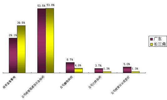 此項調查結果出乎我們的意料,選擇裁員的企業(yè)已經占到了20.8%,但是多數(shù)企業(yè)還是選擇了調整經營策略。我們特別希望有遠見的企業(yè)不要把裁員作為應對危機的主要措施,這也不符合我們“和諧社會”的主旋律。只要能正確的面對,認真分析企業(yè)的優(yōu)勢,研究市場的動向,合理配置企業(yè)資源,充分發(fā)揮員工的潛力,調動員工的積極性,企業(yè)一定會有新的轉機。企業(yè)如能和員工共克時艱,就會加深員工對企業(yè)的感情,這種情感會轉化為企業(yè)的一種優(yōu)勢資源。(見圖表四)