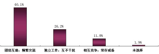 為了更深入了解電子工程師的生存環(huán)境,我們特意設置了這個問題。對每一位工程師來說,同事關系處理的如何,直接影響著他們的工作質量和生活質量,良好的同事關系,利人利己,利公利私。特別讓我們欣慰的是,60.1%的電子工程師和同事處于團結互助,頻繁交流的工作狀態(tài),在目前經濟危機的陰霾籠罩下,這樣同事關系顯的尤為重要。(見圖表七)