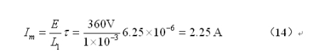 根據(jù)圖8和圖9,正常工作時(shí),流過(guò)高壓包初級(jí)線圈的最大電流Im不應(yīng)該超過(guò)極限電流值Imax的70%,由此,可以求得流過(guò)高壓包初級(jí)線圈的極限電流Imax為1.49 A 。