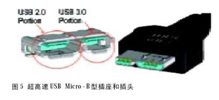 解決方案:在現(xiàn)有插頭和插座的插入面新增5 條導(dǎo)線。這樣就提供了與USB 2.0相同的機(jī)械接口,提供了完整的后向兼容性(見圖3~圖5)?,F(xiàn)有的Micro-B 型插座(見圖5)無法提供空間用于新增5條導(dǎo)線,因此需要進(jìn)行較大的更改,用同時(shí)提供2.0和3.0接口的方案。這種連接器應(yīng)該只用于小型的便攜式設(shè)備。為了避免不正確的插入,超高速USB Micro-A和AB型連接器與Micro-B 型連接器在咬合栓和輪廓方面是不同的,但在其他方面則完全相同。與機(jī)械后向兼容性一樣,這樣做的目的是保留大量的設(shè)備驅(qū)動(dòng)基礎(chǔ)設(shè)施。相同的數(shù)據(jù)傳輸類型、中斷、塊狀和等時(shí)存儲(chǔ)設(shè)備都保留了下來。最后,這個(gè)標(biāo)準(zhǔn)保留了現(xiàn)有USB的易用性。