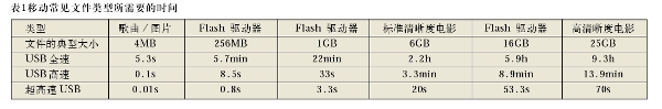 因此,基于Flash的外圍設(shè)備將受益并最終需要高得多的超高速USB 數(shù)據(jù)傳輸速率。其中,包括最常見的USB外圍設(shè)備——無處不在的Flash 驅(qū)動(dòng)器!表1總結(jié)了從USB全速到高速,再到超高速USB的用戶體驗(yàn)。需要與個(gè)人計(jì)算機(jī)之間進(jìn)行大量文件或較大文件快速移動(dòng)的多媒體應(yīng)用將會(huì)從超高速USB中獲益良多。它為那些需要在計(jì)算機(jī)和便攜式消費(fèi)類產(chǎn)品之間同步多媒體數(shù)據(jù)的用戶提供了滿意的帶寬。