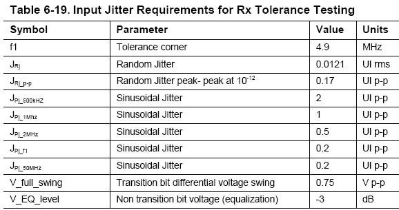 在接收機(jī)測試中,碼型發(fā)生器和待測試芯片的擴(kuò)頻時(shí)鐘功能(SSC)都打開,輸出信號(hào)的特征需滿足下圖3所示:信號(hào)的峰峰值大于750毫伏,-3dB的去加重,隨機(jī)抖動(dòng)的RMS值為0.0121UI(Unit Interval的簡稱,即1個(gè)比特的時(shí)間),即0.0121*200ps = 2.42ps,添加的正弦抖動(dòng)的頻率為500kHz、1MHz、2MHz、4.9MHz、50MHz,其對應(yīng)的抖動(dòng)峰峰值為2UI、1UI、0.5UI、0.2UI、0.2UI。要求在添加了上述數(shù)量的隨機(jī)抖動(dòng)和正弦抖動(dòng)后誤碼率小于 。其中,頻率低于500KHz的抖動(dòng)大于2個(gè)比特,說明USB3.0芯片的接收端需具備較強(qiáng)的抖動(dòng)過濾能力,因?yàn)槎鄶?shù)開關(guān)電源工作在這個(gè)頻段。