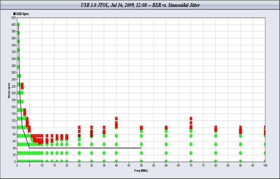 力科PeRT3可以自動(dòng)測量多個(gè)頻點(diǎn)下的抖動(dòng)容限和誤碼率,如下圖5所示為某USB3.0芯片的抖動(dòng)容限測試結(jié)果,橫軸為頻率,縱軸為該頻點(diǎn)的抖動(dòng)幅度,黑線為USB3.0規(guī)范要求的抖動(dòng)容限,紅點(diǎn)為出現(xiàn)誤碼的正弦抖動(dòng)的幅度,由于紅點(diǎn)都在黑線之上,說明該芯片接收端的抖動(dòng)容限滿足規(guī)范要求。