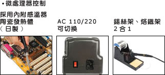 采用精密CPU數(shù)位控溫電路, 和日本進(jìn)口陶瓷發(fā)熱體, 精準(zhǔn)控制溫度200~480ºC, 整體防靜電結(jié)構(gòu), 輸入電壓AC 110V/220V可切換, 配合安全回路保護(hù), 流線可堆疊外型, 開關(guān)前置、斜面無視角差, 適合各種環(huán)境使用焊臺、烙鐵架分離設(shè)計, 并具有錫絲架功能、使用便利.