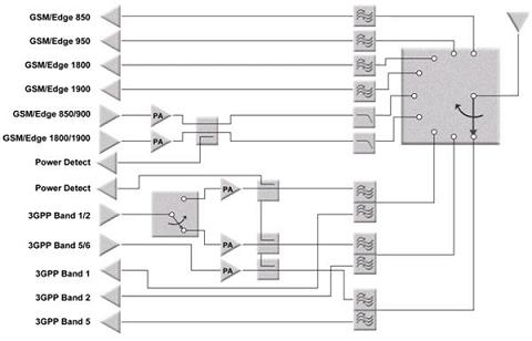 圖2:這個(gè)SP9T正在處理三頻段的WCDMA,它提供了到達(dá)雙工器和三個(gè)功率放大器模組的通道。