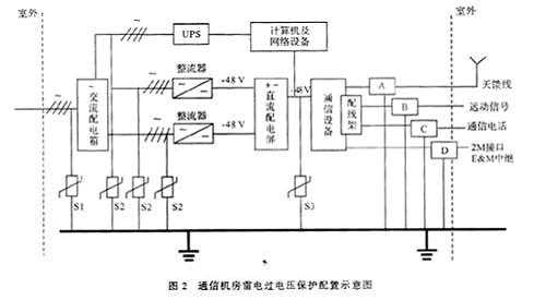 機(jī)房?jī)?nèi)專設(shè)交流配電箱。該處配電箱供電采用三相四線制供電,嚴(yán)格實(shí)現(xiàn)機(jī)房?jī)?nèi)各設(shè)備接地接零分開;安裝電源和信號(hào)避雷器,其避雷器接地采用合防雷器,S2為DEHNguard T385型電源2級(jí)防雷器,S3為DEHNrail 48FML型電源3級(jí)防雷器(直流48 V),A為UGK/N(2.5 G)天饋線防雷器,B為YG20-A音頻隔離變壓器,C為ZH型中和變壓器,D為同軸防雷器。
