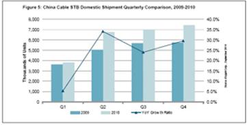 2010年中國有線機(jī)頂盒出貨量將達(dá)到2510萬個,比2009年的2010萬個增長24.8%。由于各省有線電視運(yùn)營商加快發(fā)展用戶,以及小型運(yùn)營商推動客戶從模擬向數(shù)字服務(wù)過渡,預(yù)計第二季度創(chuàng)下全年的最強(qiáng)勁增長水平。2010年第二季度有線機(jī)頂盒出貨量增長到680萬個,比2009年同期的500萬個增長34%。