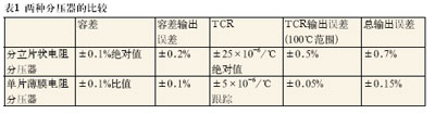 通過(guò)選擇單片襯底上的高精度薄膜分壓器,設(shè)計(jì)人員可以確保分壓器中的電阻元件具有非常相似的電氣特性,并在溫度和時(shí)間變化時(shí)實(shí)現(xiàn)很好的跟蹤。在公用襯底上的材料和處理過(guò)程的相似性確保了分壓器能夠在所有比值和環(huán)境下更為穩(wěn)定,且性能更好。