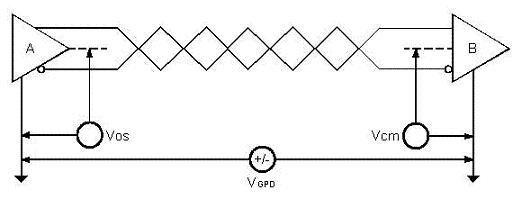 如圖1所示,當(dāng)發(fā)送器A向接收器B發(fā)送數(shù)據(jù)時,發(fā)送器A的輸出共模電壓為VOS,由于兩個系統(tǒng)具有各自獨立的接地系統(tǒng)存在著地電位差VGPD,那么接收器輸入端的共模電壓就會達(dá)到VCM=VOS+VGPD。RS-485標(biāo)準(zhǔn)規(guī)定VOS≤3V,但VGPD可能會有很大幅度(十幾伏甚至數(shù)十伏),并可能伴有強(qiáng)干擾信號致使接收器共模輸入VCM超出正常圍,在信號線上產(chǎn)生干擾電流輕則影響正常通信,重則損壞設(shè)備。