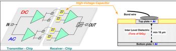 圖2的右側(cè)顯示了一個高壓電容器的橫截面。從發(fā)送器芯片出來的接合線連接到接收機端電容器鋁頂板。底板(也為鋁質(zhì))連接到接收機邏輯。板之間是夾層電介質(zhì),其為16-μm厚的二氧化硅(SiO2)層。