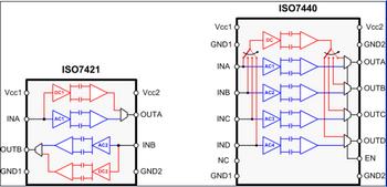 電容隔離的另外一個優(yōu)點是每個電容123毫微微法拉(123x10-15F)的超低容量,從而允許極高的數(shù)據(jù)速率傳輸并實現(xiàn)多通道隔離器的微電容幾何尺寸。