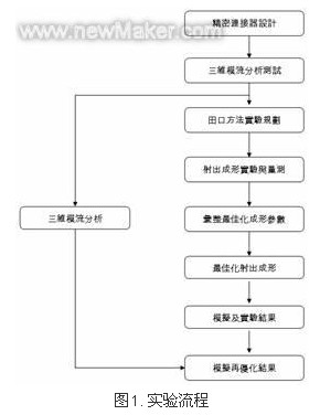 透過本研究實(shí)驗(yàn)所規(guī)劃之流程(圖1),搭配田口實(shí)驗(yàn)規(guī)劃法,加以探討模流分析與實(shí)際射出成形所得之結(jié)果,是否可有效改善塑料平坦度,進(jìn)而獲得最佳化之射出成形參數(shù)。