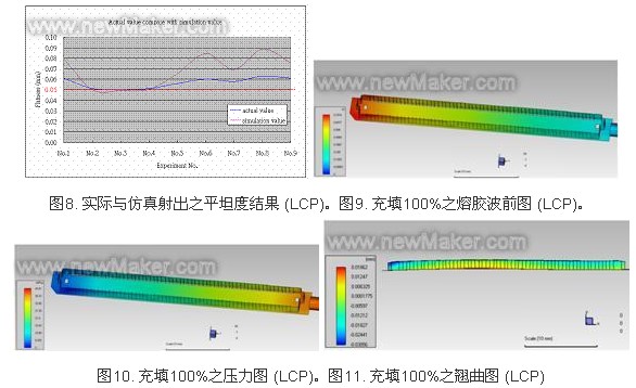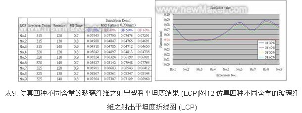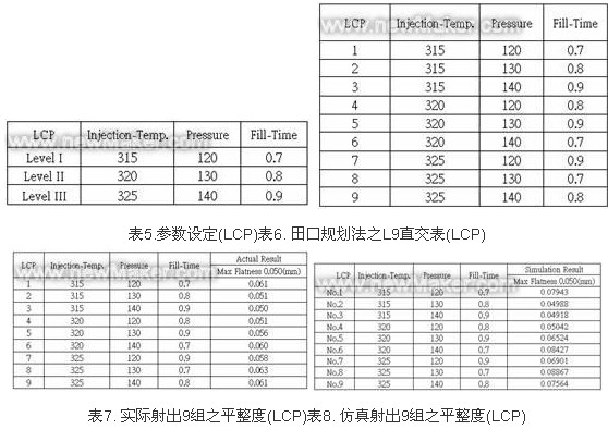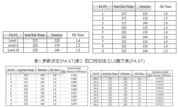 [page]塑料射料LCP在已設(shè)定射出溫度、射出壓力、充填時(shí)間之條件參數(shù)后,再設(shè)定仿真之各參數(shù),如表5所示。透過田口方法實(shí)驗(yàn)規(guī)劃,可得L9直交表,如表6所 示。依據(jù)L9直交表,可清楚得知有9組田口規(guī)劃之實(shí)驗(yàn)參數(shù),再分別針對(duì)這9組參數(shù),實(shí)際作射出成形,并量測(cè)實(shí)際翹曲度,量測(cè)之結(jié)果,大部份數(shù)據(jù)皆不符合塑 料翹曲度(Flatness) 0.05mm規(guī)格內(nèi),如表7所示。仿真之最佳化參數(shù)為第三組,其參數(shù)為射出溫度315℃、射出壓力 140 MPa 、充填時(shí)間0.9 s,如圖3所示。