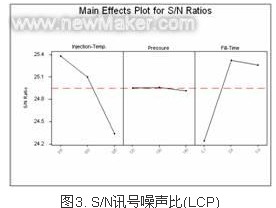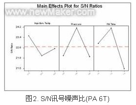由實(shí)驗(yàn)數(shù)據(jù)輸入田口法計(jì)算機(jī)程序后,經(jīng)因子變動(dòng)計(jì)算,可得S/N(訊號(hào)/噪聲比),如圖2所示。由S/N得到最佳化參數(shù)為,射出溫度315℃、射出壓力 130 MPa、充填時(shí)間1.5 s。此最佳化參數(shù)出現(xiàn)于田口規(guī)劃法L9直交表內(nèi)之第二組實(shí)際數(shù)據(jù),而且實(shí)際射出與仿真射出所得之?dāng)?shù)據(jù)也都是第二組為最佳的,由此可得知PA 6T田口法最佳化組合與實(shí)際射出與仿真射出是互相對(duì)應(yīng)的,符合理論與實(shí)務(wù)相互映證,最佳化成形之塑料其平坦度為0.04mm,符合平坦度不超過 0.05mm之目標(biāo)值。