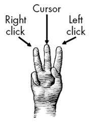 圖1(b)中的傳感器可實(shí)現(xiàn)計(jì)算導(dǎo)航板,從而避免了使用普通導(dǎo)航板所需要的選擇按鈕。如圖2所示,中指移動(dòng)光標(biāo),食指和無(wú)名指觸摸屏幕,指示鼠標(biāo)左鍵或者右鍵點(diǎn)擊。去掉移動(dòng)部分后,電容觸摸屏傳感器比按鍵和按鍵開(kāi)關(guān)更耐用。