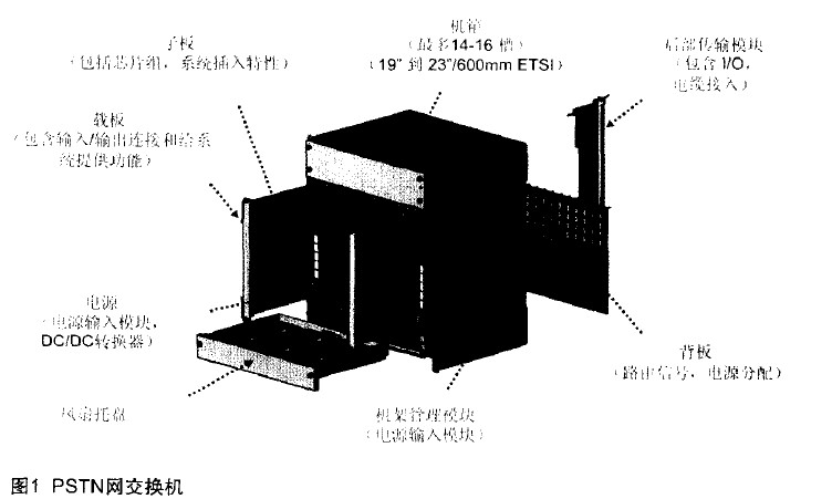 圖1所示為一個(gè)PSTN網(wǎng)的交換機(jī),該交換機(jī)由7個(gè)部分組成。除了機(jī)箱尺寸的區(qū)別,機(jī)箱底部是一個(gè)機(jī)架的管理模塊,它包括管理模塊、傳輸背板和傳輸模塊。最前面有子板、載板、電源板,以及風(fēng)冷系統(tǒng)、電扇托板。在交換機(jī)中,它的主要載板就是電話信息的傳輸以及輸入/輸出的連接,輸入,輸出系統(tǒng)所組成的只有很少的電腦板以及信令控制板。
