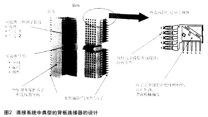 圖2是典型的連接系統(tǒng)中背板連接器的設(shè)計(jì)。它可以提供三種端子長度,即接地端子、信號(hào)1端子、信號(hào)2端子三個(gè)端子的長度是不同的。這是為了保證插座和插針在互相連接的時(shí)候,如果接反了,就無法插入。第二個(gè)是中問部分,它是用于安裝維修用的,整個(gè)插針板在插入的過程中,可以用來導(dǎo)向,甚至可以保證編碼和極性的正確。外壁用來保護(hù)端子和連接器的導(dǎo)向,這個(gè)端子就是插針部分,采用柔性插針。從右半部分圖中可以看到,外殼被拆除后,更清楚地顯示出了接觸面。它采用了雙柱冗余的接觸面設(shè)計(jì),這樣可以大大提高接觸的可靠性。