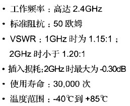移動(dòng)手機(jī)用的開關(guān)式同軸連接器主要用于提供手機(jī)內(nèi)的天線和汽車外部天線之間的信號(hào)的切換。這種開關(guān)式的連接器,它的表面安裝有三種高度,分別是3.5mm、4.5mm和6.0 mm。表面安裝開關(guān)式連接器直接和手機(jī)天線連接。由于功率元件和天線或開關(guān)間距離短,因此內(nèi)部沒有電纜,信號(hào)傳輸非常好。它的性能指標(biāo)如下: