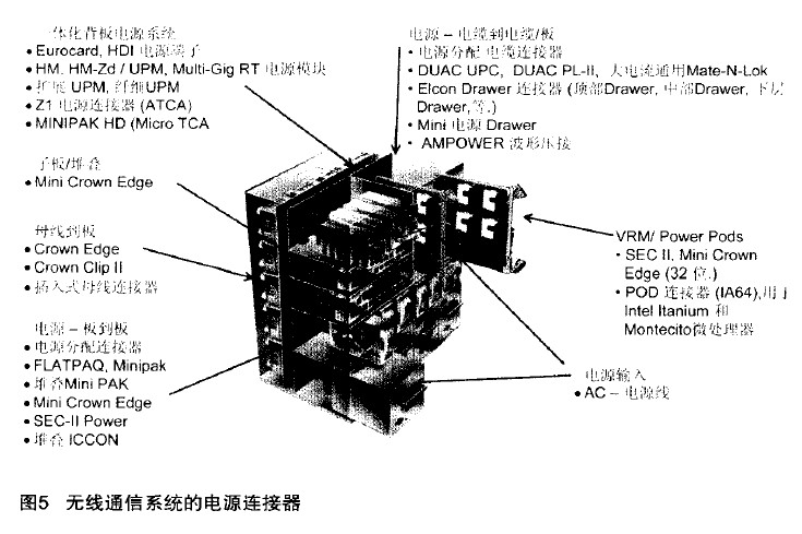 無線通信系統(tǒng)中所采用的電源連接器(圖5)的種類包括一體化背板電源系統(tǒng)、子板/堆疊用連接器、信號(hào)母線到板之間的連接器、板到板的電源連接器、電源到電纜/電纜Nrn; 刷板連接器、微處理器所用電源連接器以及電源輸入所用連接器。