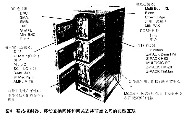 圖4表示的是基站控制器、移動(dòng)交換網(wǎng)絡(luò)和網(wǎng)關(guān)支持節(jié)點(diǎn)之間的典型互聯(lián)。這些互聯(lián)也用到了多種連接器。
