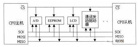 SPI(serial peripheral interface,串行外圍設備接口)總線技術(shù)是Motorola公司推出的一種同步串行接口。它用于CPU與各種外圍器件進行全雙工、同步串行通訊。它只需四條線就可以完成MCU與各種外圍器件的通訊,這四條線是:串行時鐘線(CSK)、主機輸入/從機輸出數(shù)據(jù)線(MISO)、主機輸出/從機輸入數(shù)據(jù)線(MOSI)、低電平有效從機選擇線CS。當SPI工作時,在移位寄存器中的數(shù)據(jù)逐位從輸出引腳(MOSI)輸出(高位在前),同時從輸入引腳(MISO)接收的數(shù)據(jù)逐位移到移位寄存器(高位在前)。發(fā)送一個字節(jié)后,從另一個外圍器件接收的字節(jié)數(shù)據(jù)進入移位寄存器中。即完成一個字節(jié)數(shù)據(jù)傳輸?shù)膶嵸|(zhì)是兩個器件寄存器內(nèi)容的交換。主SPI的時鐘信號(SCK)使傳輸同步。其典型系統(tǒng)框圖如下圖所示。