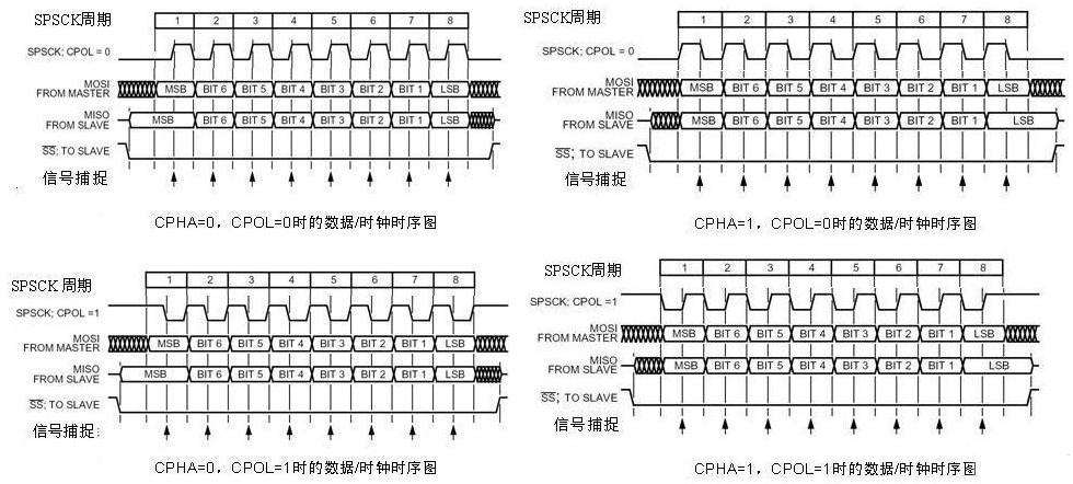 當CPHA=0、CPOL=0時SPI總線工作在方式1。MISO引腳上的數(shù)據(jù)在第一個SPSCK沿跳變之前已經(jīng)上線了,而為了保證正確傳輸,MOSI引腳的MSB位必須與SPSCK的第一個邊沿同步,在SPI傳輸過程中,首先將數(shù)據(jù)上線,然后在同步時鐘信號的上升沿時,SPI的接收方捕捉位信號,在時鐘信號的一個周期結(jié)束時(下降沿),下一位數(shù)據(jù)信號上線,再重復上述過程,直到一個字節(jié)的8位信號傳輸結(jié)束。