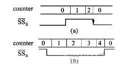 對從模式(MSTR=0),在沒有數(shù)據(jù)傳送的時候,SS高電平表示從器件未被選中,從器件不工作,MISO輸出高阻;在數(shù)據(jù)傳輸過程中,片選信號SS必須接低電平,且SS不允許跳變。如果SS從低電平跳到高電平,在SS的上跳沿,SPI模塊也將檢測到模式錯誤,清空內(nèi)部計數(shù)器counter,并結(jié)束正在進行的數(shù)據(jù)傳輸。直到SS恢復為低電平,重新使SPEN=1時,才重新開始工作,如圖6(b)所示。