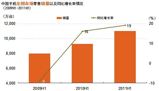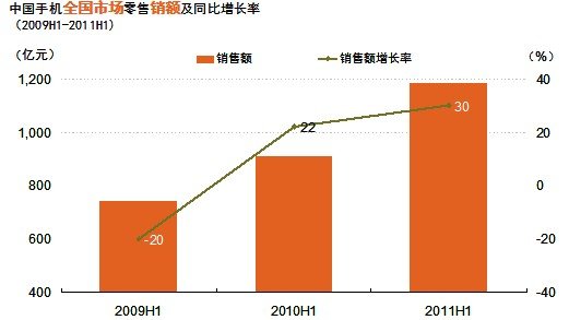 2011年上半年手機(jī)市場繼續(xù)保持較快增長。據(jù)GfK(捷孚凱中國)全國零售監(jiān)測數(shù)據(jù)顯示,2011年上半年銷售量已達(dá)到1.1億臺,同比增長19%,銷售額達(dá)到1186億元,銷售額同比增長30%。