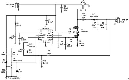 構(gòu)建起如圖3 所示電路,并對其進行描述。該電路可在汽車市場獲得應(yīng)用。這里,其擁有一個8V 到36V 的寬范圍輸入,可以為穩(wěn)定12-V 輸出以上或者以下。汽車市場更喜歡使用陶瓷電容器,原因是其寬溫度范圍、長壽命、高紋波電流額定值和高可靠性。結(jié)果,耦合電容器(C6) 便為陶瓷的。這就意味著,相比電解電容器,它擁有較高的AC 電壓,同時這種電路會對低漏電感值更加敏感。