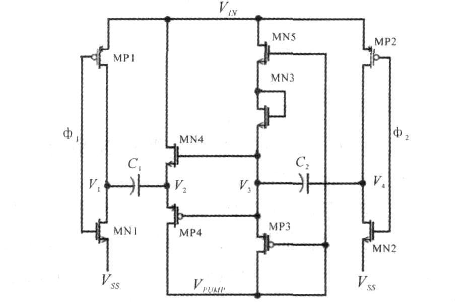 自舉電荷泵不需要為MN2和MP2提供柵驅(qū)動(dòng)電壓,控制簡單,但輸出電壓會(huì)有一個(gè)閾值損失。圖3是改進(jìn)后的電荷泵電路圖,1和2為互補(bǔ)無交疊時(shí)鐘。由MN2、MN5、MP3、MP2和電容C2組成的次電荷泵為MN4、MP4提供柵壓,以保證其完全關(guān)斷和開啟。當(dāng)1為低電平時(shí),MP1導(dǎo)通,電位增加,此時(shí),V3電位為零,MP4導(dǎo)通,V2上的電荷轉(zhuǎn)移到柵電容CGATE上,VPUMP電位升高。當(dāng)1為高電平時(shí),MP2導(dǎo)通,為C2充電,V4電位上升至電源電位,V3電位隨之上升,MP3導(dǎo)通,VPUMP電位繼續(xù)升高。MN3相當(dāng)于二極管,起單向?qū)щ姷淖饔谩?br />