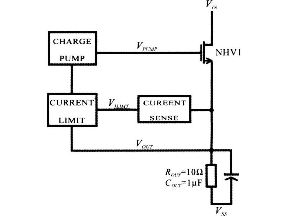 圖1為USB電源開關(guān)的整體設(shè)計(jì)。其中,VIN為電源輸入,VOUT為USB的輸出。在負(fù)載正常的情況下,由電荷泵產(chǎn)生足夠高的柵驅(qū)動(dòng)電壓,使NHV1工作在深線性區(qū),以降低從輸入電源(VIN)到負(fù)載電壓(VOUT)的導(dǎo)通損耗。當(dāng)功率管電流高于1A時(shí),Currentsense輸出高電平給過流保護(hù)電路(Currentlimit);過流保護(hù)電路通過反饋負(fù)載電壓給電荷泵,調(diào)節(jié)電荷泵輸出(VPUMP),從而使功率管的工作狀態(tài)由線性區(qū)變?yōu)轱柡蛥^(qū),限制功率管電流,達(dá)到保護(hù)功率管的目的。當(dāng)負(fù)載恢復(fù)正常后,Currentsense輸出低電平,電荷泵正常工作。