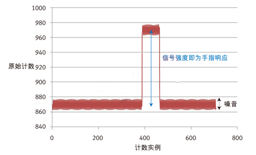 圖5:原始傳感器數(shù)據(jù)由手指響應(yīng)和噪音構(gòu)成。手指響應(yīng),也稱為信號強度,是當手指放在傳感器上時通過感應(yīng)系統(tǒng)可以看到的原始計數(shù)的差別