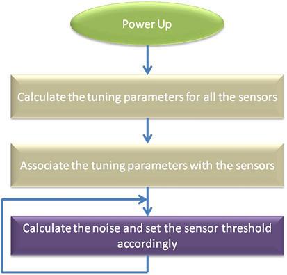 噪聲是一個隨機時間函數(shù),由其自身性質(zhì)決定。工作一個小時后和剛開機時是不一樣的,下一個時刻又不相同。因此,手指檢測的閾值應(yīng)基于傳感器原始計數(shù)檢測到的噪聲來調(diào)整。圖8顯示了自調(diào)試系統(tǒng)如何基于系統(tǒng)噪聲調(diào)整手指閾值。
